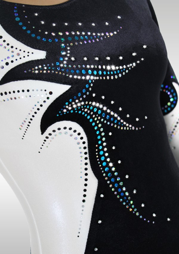 Turnanzug aus weissem wetlook kombiniert mit schwarzem glattem Samt.